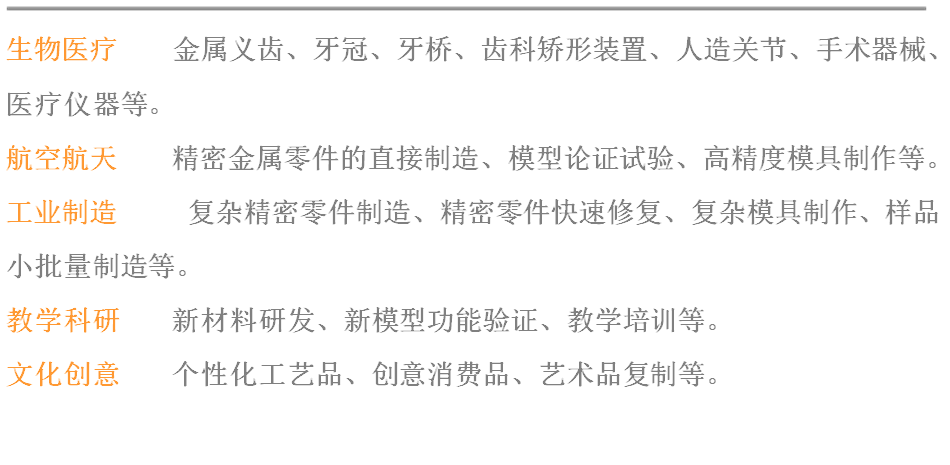 應用領域:生命醫(yī)學、航空工業(yè)、船用動力、軍械裝備、模具、精密機械零件、工業(yè)化機械零件樣品快速制造、個性化工藝品定制。